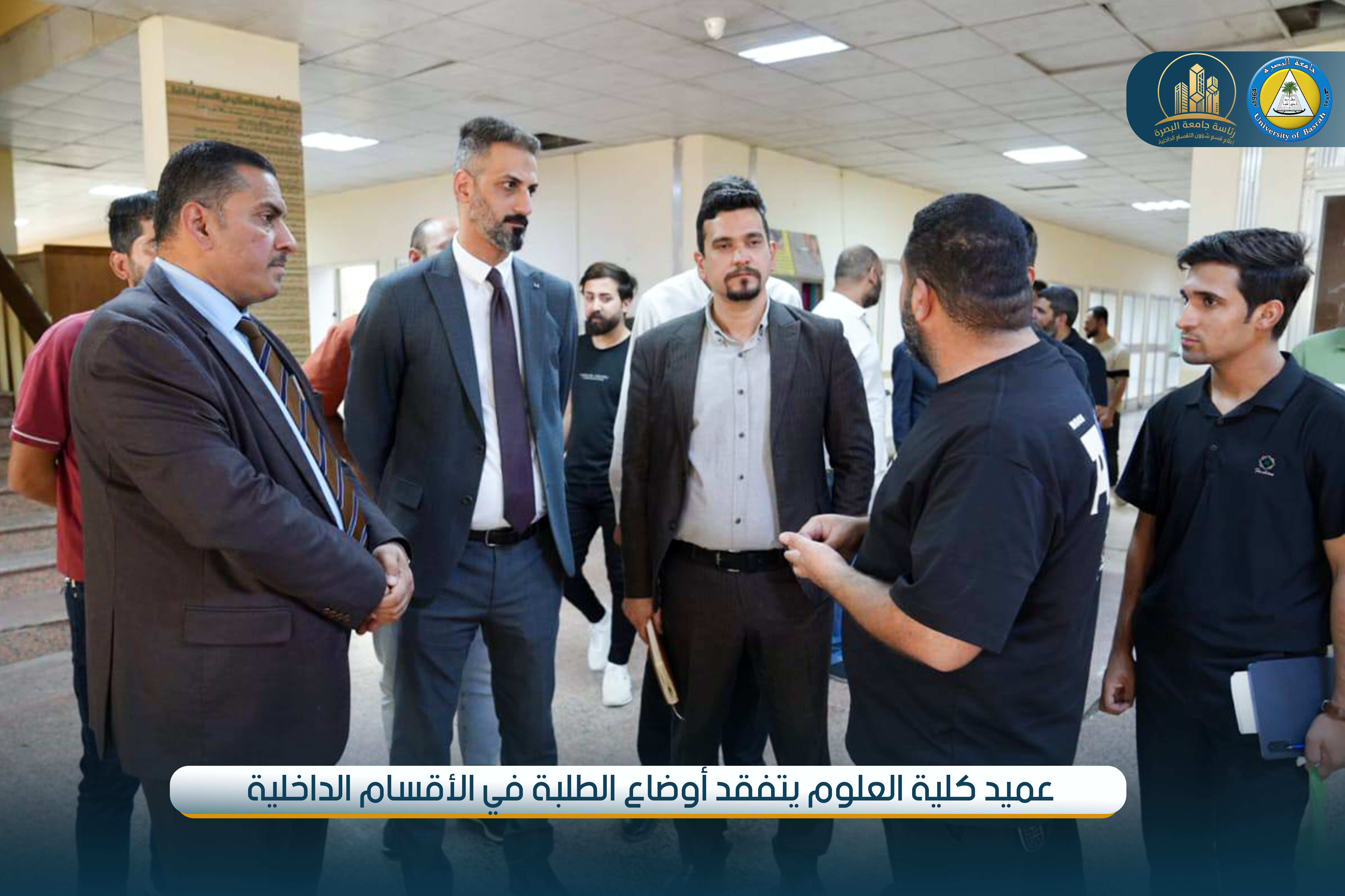 ضمن حرص عمادة كلية العلوم على متابعة أوضاع الطلبة والاهتمام بواقعهم الخدمي والمعيشي أجرى السيد عميد كلية العلوم الأستاذ الدكتور ( علي عبدالامام عبدالزهره ) المحترم زيارة تفقدية إلى قسم شؤون الأقسام الداخلية