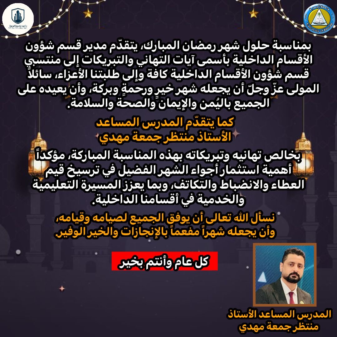 كما يتقدّم المدرس المساعد الأستاذ منتظر جمعة مهدي بخالص تهانيه وتبريكاته بهذه المناسبة المباركة، مؤكداً أهمية استثمار أجواء الشهر الفضيل في ترسيخ قيم العطاء والانضباط والتكاتف، وبما يعزز المسيرة التعليمية والخدمية في أقسامنا الداخلية.